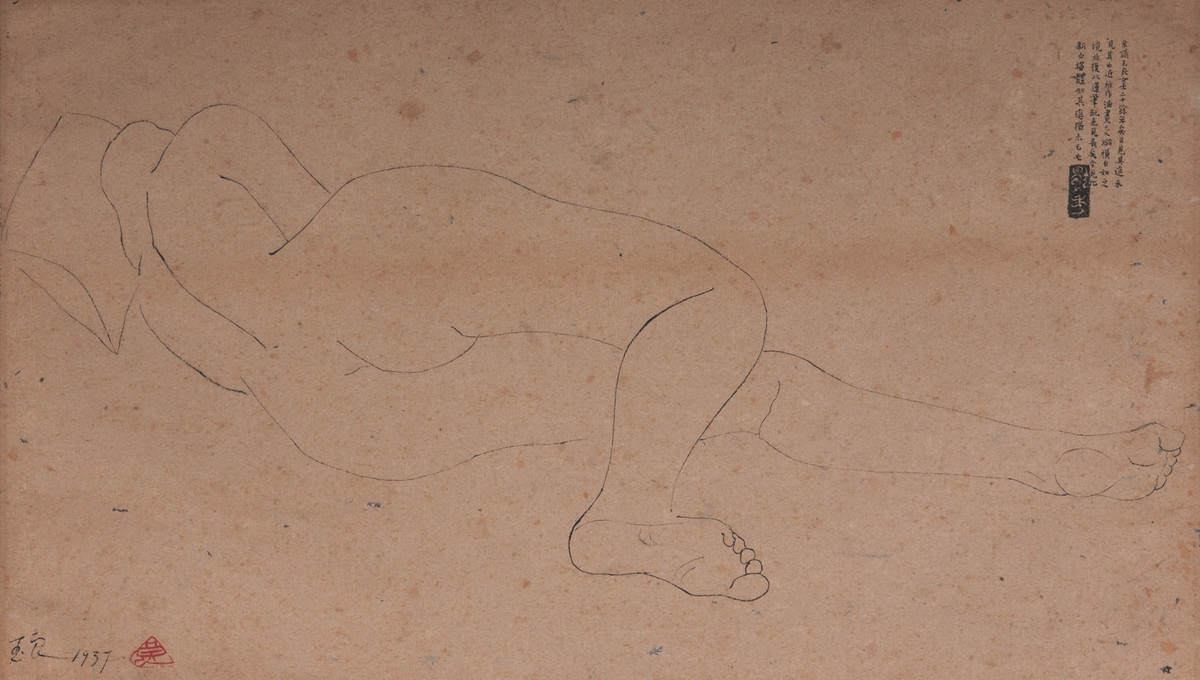 《侧身背卧女人体》,被陈独秀题跋赞为”新白描”之作,安徽博物院藏。
