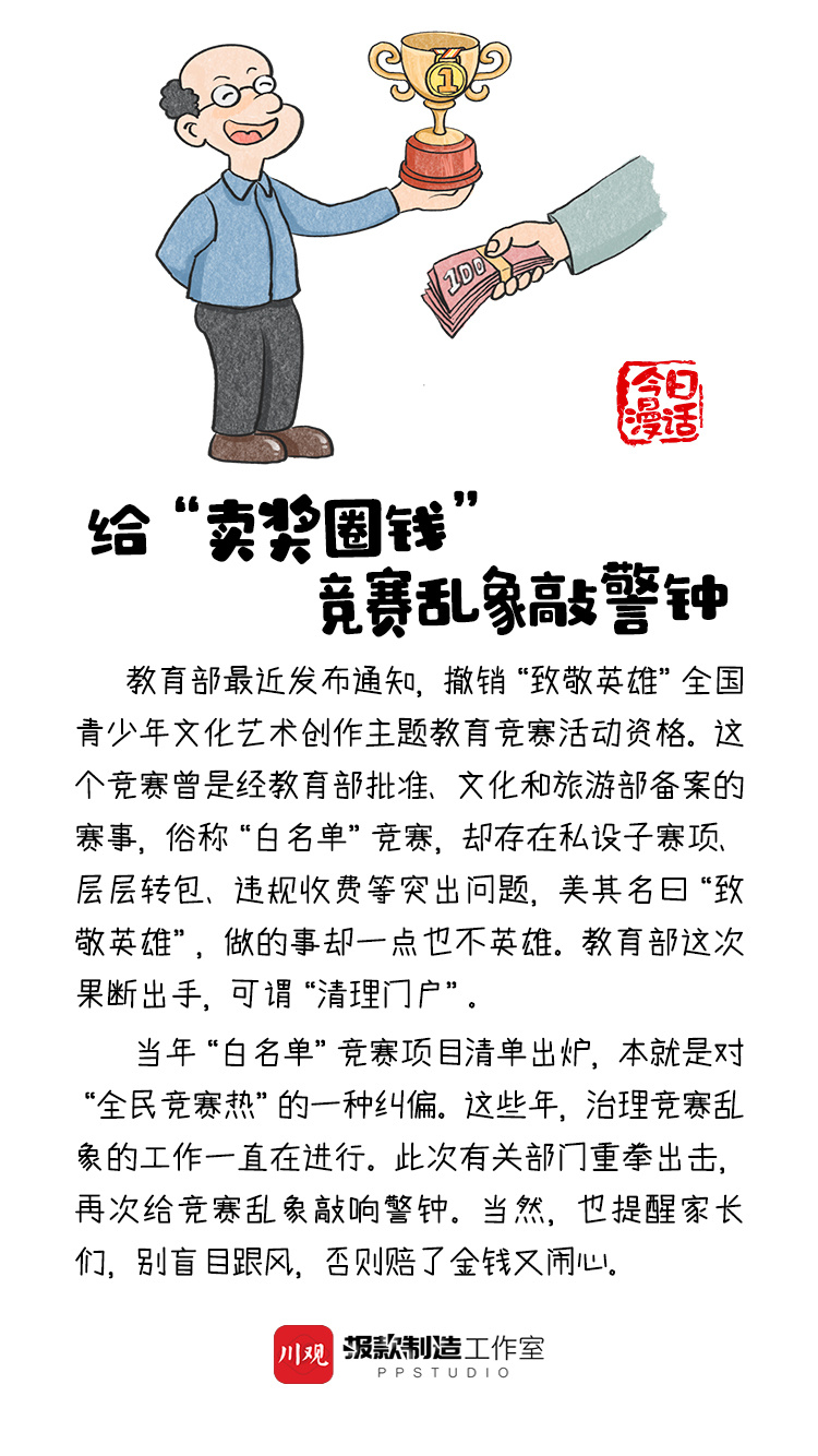 教育部最近发布通知,撤销“致敬英雄”全国青少年文化艺术创作主题教育竞赛活动资格。这个竞赛曾是经教育部批准、文化和旅游部备案的赛事,俗称“白名单”竞赛,却存在私设子赛项、层层转包、违规收费等突出问题。对此,你怎么看?