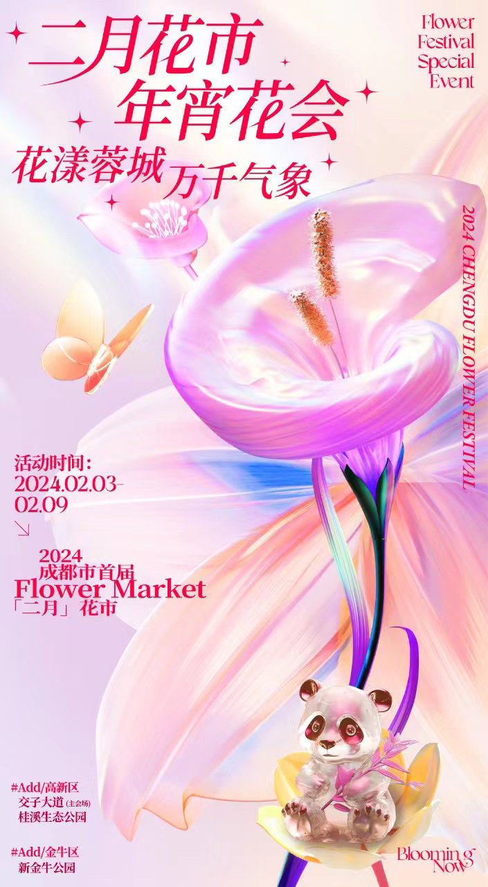 此外,本次活动侧重打造年宵花场景式展销,满足市民群众的精神文化体验,将设置大型花卉舞台、人文市集、花市快闪区,以及浪漫的DP氛围配套、2024成都世园会的宣传推介区。