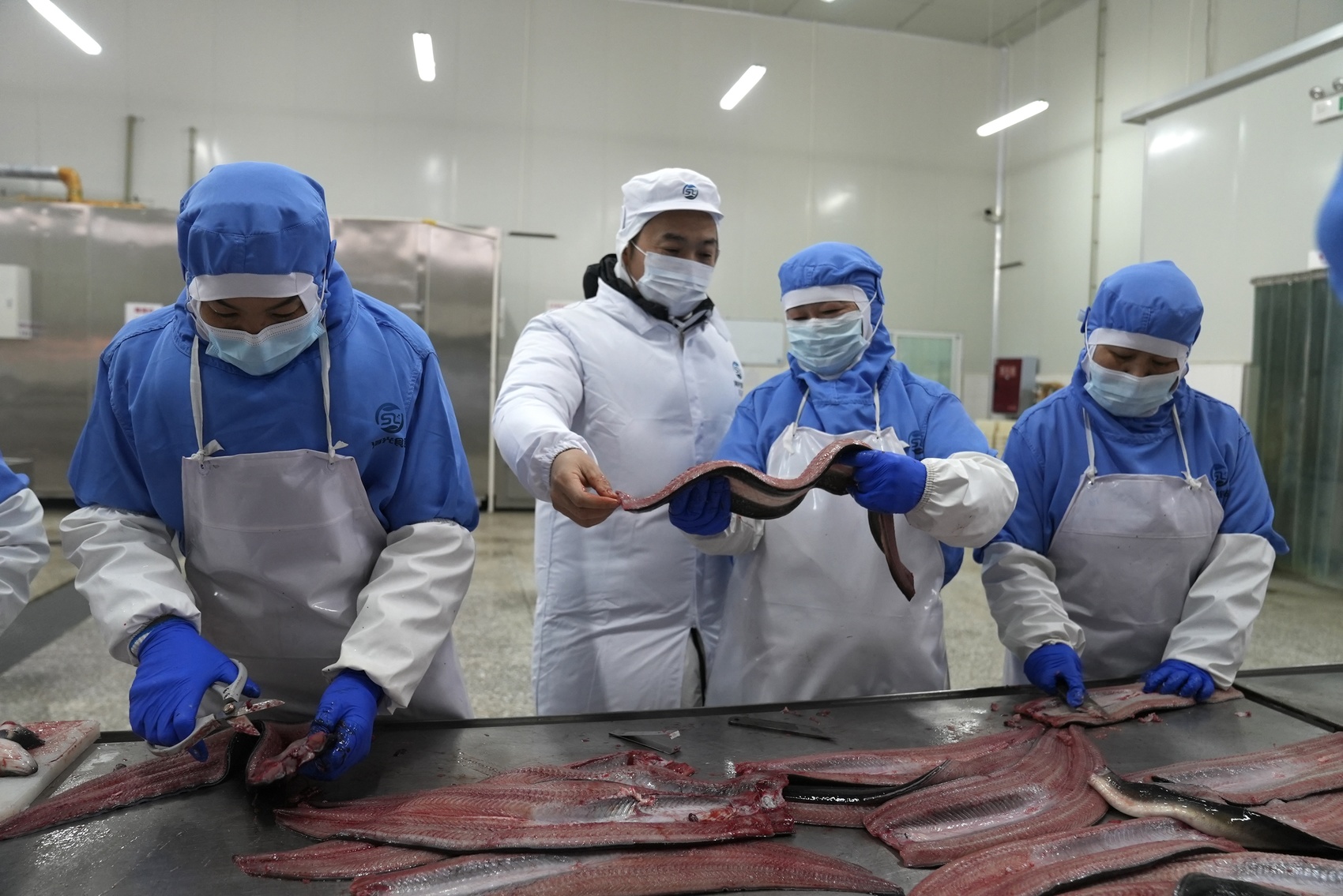 沈明国(左二)指导工人对鳗鱼进行宰杀切割。