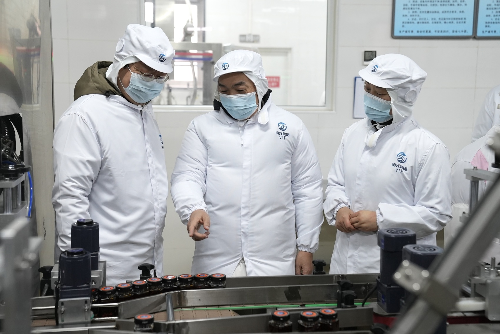 沈明国带领嘉宾参观鳗鱼调味酱生产线。