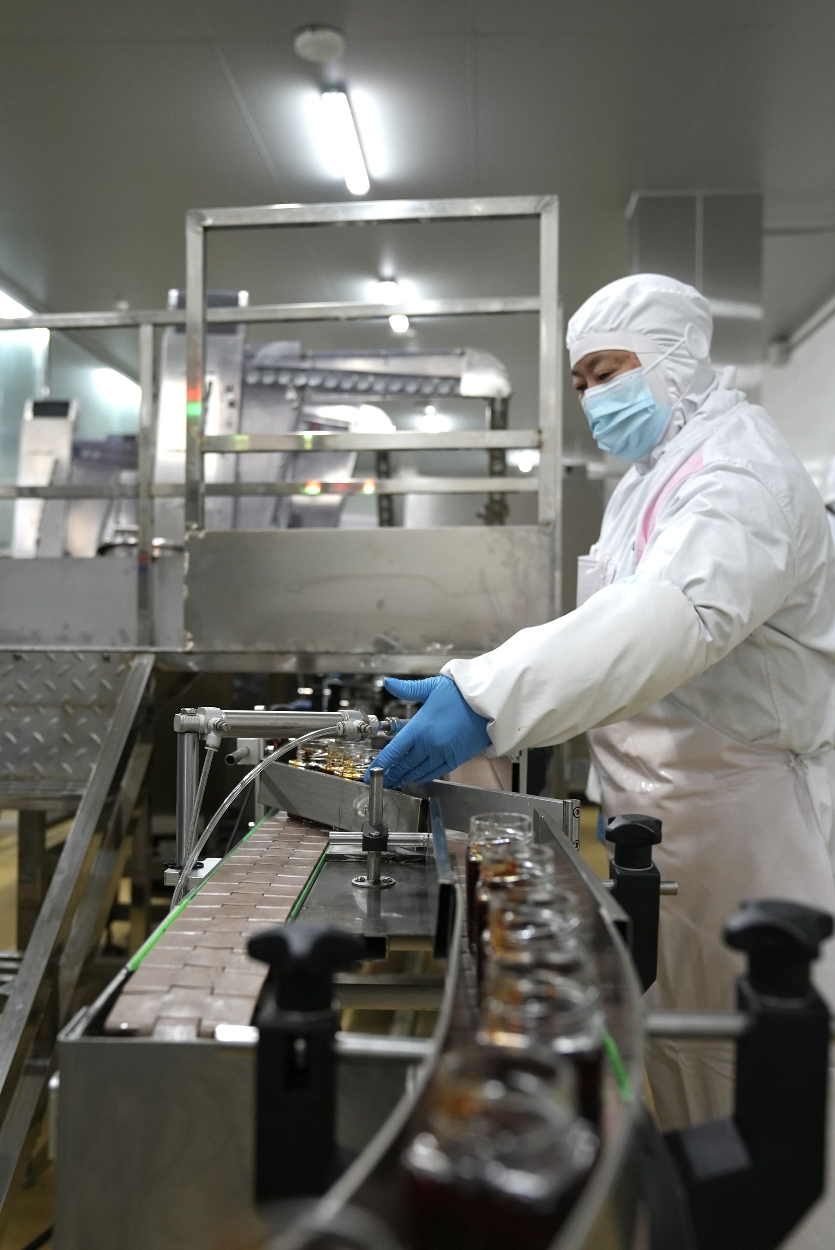 工人正在鳗鱼调味酱生产线上对产品品质把关。