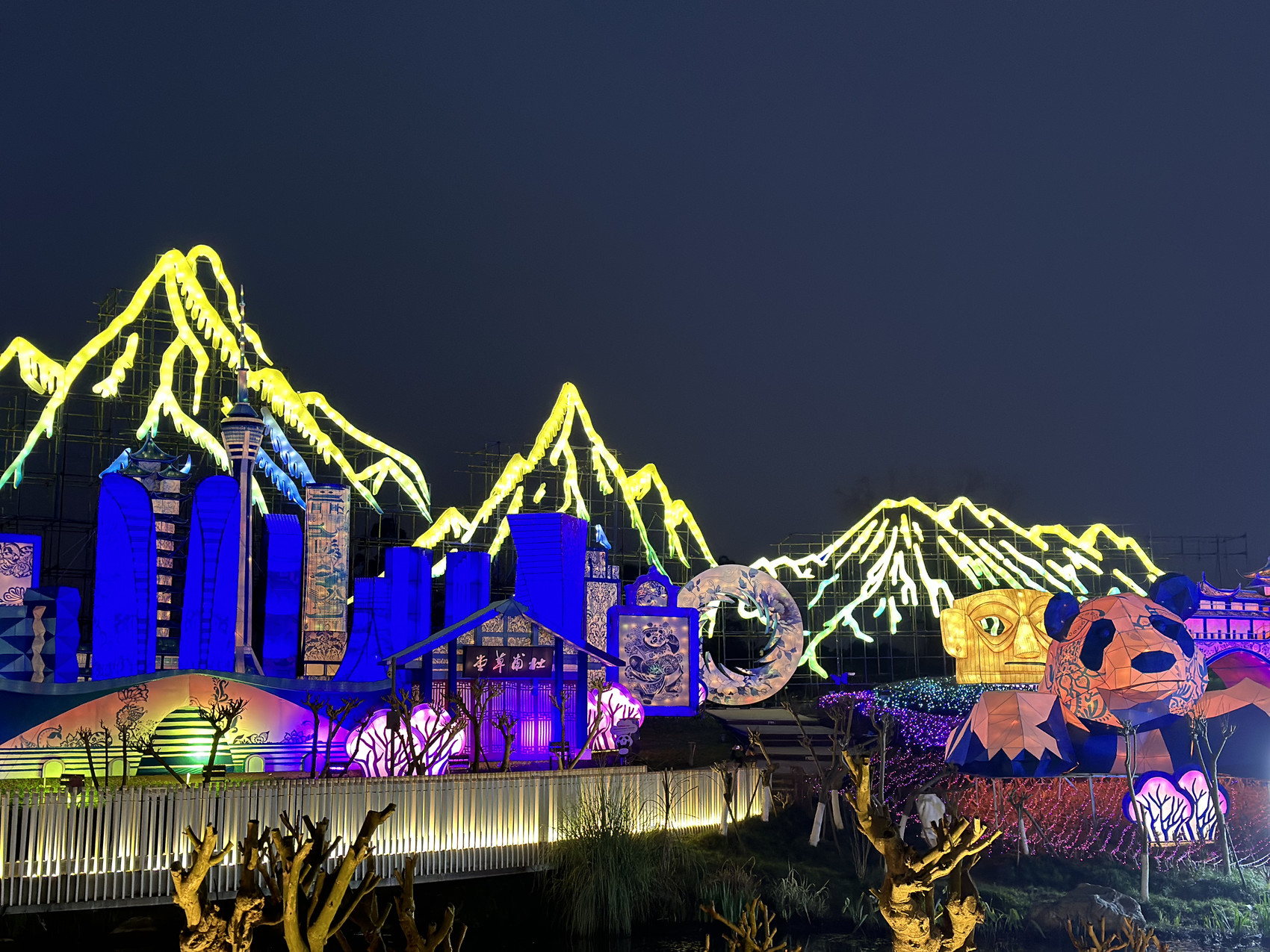 其中“雪山下的公园城市”灯组高近20米、长近100米,气势恢宏。前期面向社会征集的小朋友“熊猫童画”主题画作“熊猫机器人”“熊猫森林”等作品也被制作成灯组正式点亮,还有“盖碗龙”沏茶等特色灯组璀璨夺目。