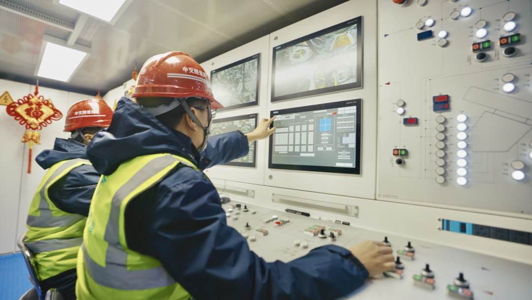 针对地质条件复杂、高水压、长距离硬岩掘进等施工重难点,项目团队联合业内权威专家在刀盘形式、刀具类型、耐压耐磨能力等方面开展专题研究,量身制定适应长距离硬岩地层的超大直径泥水平衡盾构机“深蓝号”。盾构机开挖直径15.63米,整机机长165米,重量5300吨,并配备伸缩式主驱动、伸缩式开挖仓监视等智能系统。