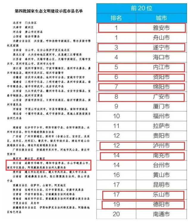 第四批国家生态文明建设示范市县名单出炉,四川5个县(市、区)上榜,总数位居全国前列;全国168个重点城市空气质量排名榜中,前20位城市中四川占了一半。