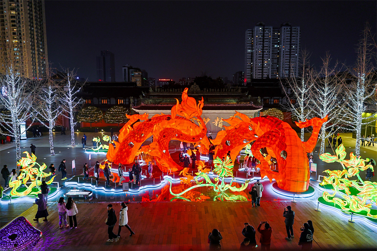 夜幕降临,在大慈寺“精妙冠世”四字照壁前,一汪水景在灯光的照耀下闪闪夺目,周遭倒映在水面,影影绰绰。红色“巨龙”翻腾出水,灵动的“鲤鱼”和摇曳的“荷叶”伴随池水潺潺的光影,引来众多市民和游客置身其中……