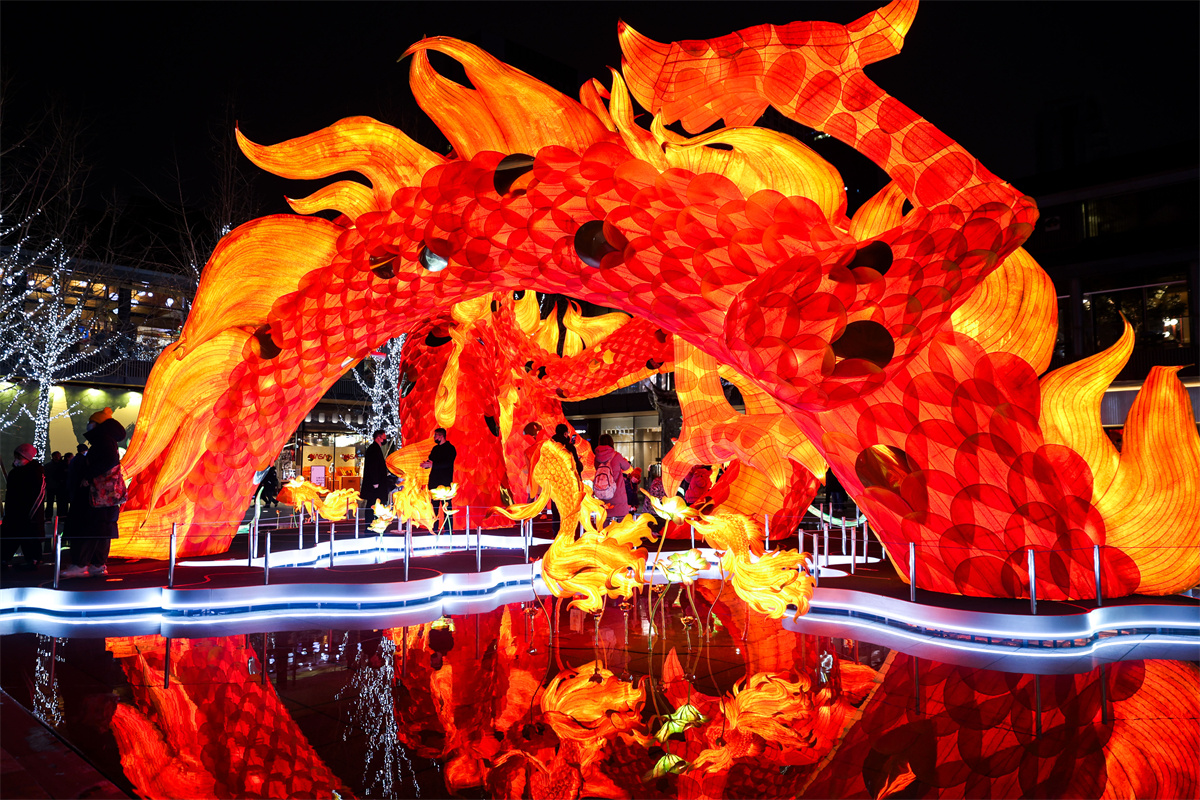 鲤跃龙腾,风生水起。喜迎甲辰龙年,成都太古里的新春艺术装置以龙为主角,结合“鲤鱼跃”“鲜花盛”“云飞扬”“池水潺潺”等中国文化中的美好意境,营造出纯正、喜庆的新年氛围。本次艺术装置由纯手工技艺打造,以传统纸艺生动呈现了“中国龙”,致敬中国传统文化。夜幕临,华灯起,巨龙与锦鲤仿若在漫广场游弋,公众步入水上,穿梭其中,赏祥瑞繁华的视觉盛宴。
