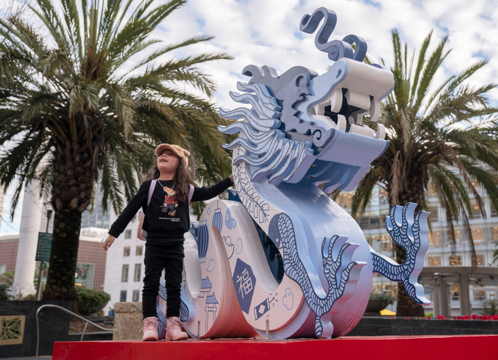 1月28日,在美国旧金山联合广场,一名女孩与龙形装置合影。