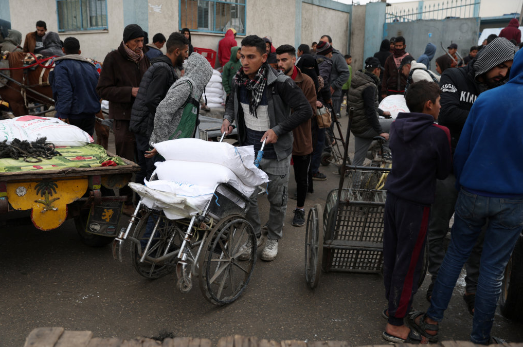 1月29日,在加沙地带南部城市拉法,人们搬运联合国近东救济工程处提供的面粉。