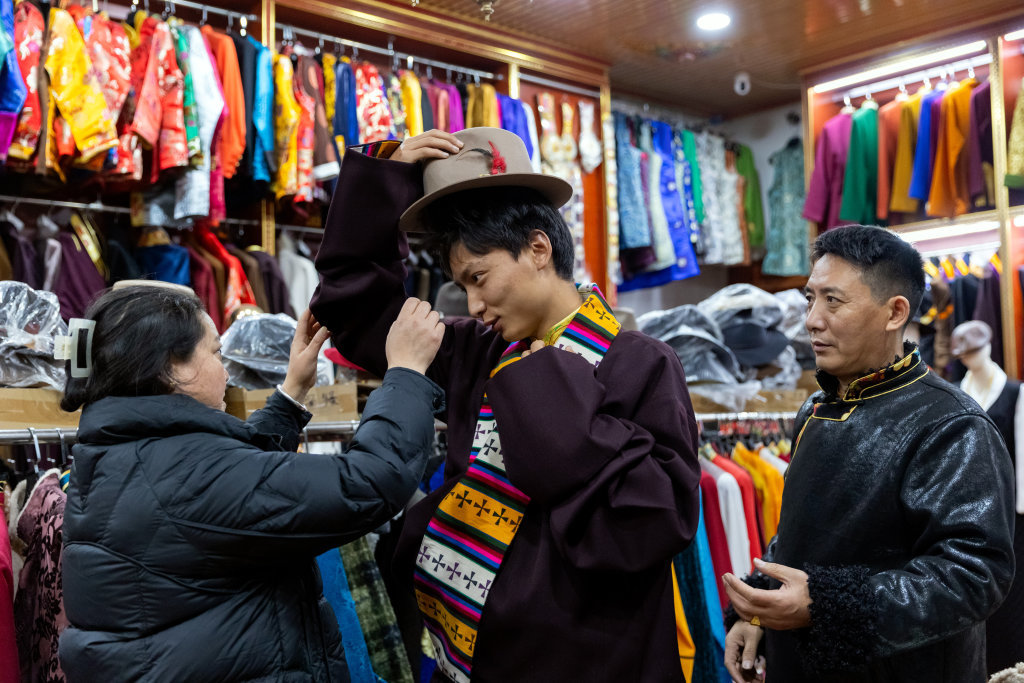 尼玛王登(右一)和妻子何英姐(左一)帮助儿子龙吉泽仁换上藏装,准备视频直播进行展示和销售(1月5日摄)。龙吉泽仁如今在四川阿坝州上大学,最近因为要参加考试才来到成都,父母平时在成都经营生意,两代人聚少离多。