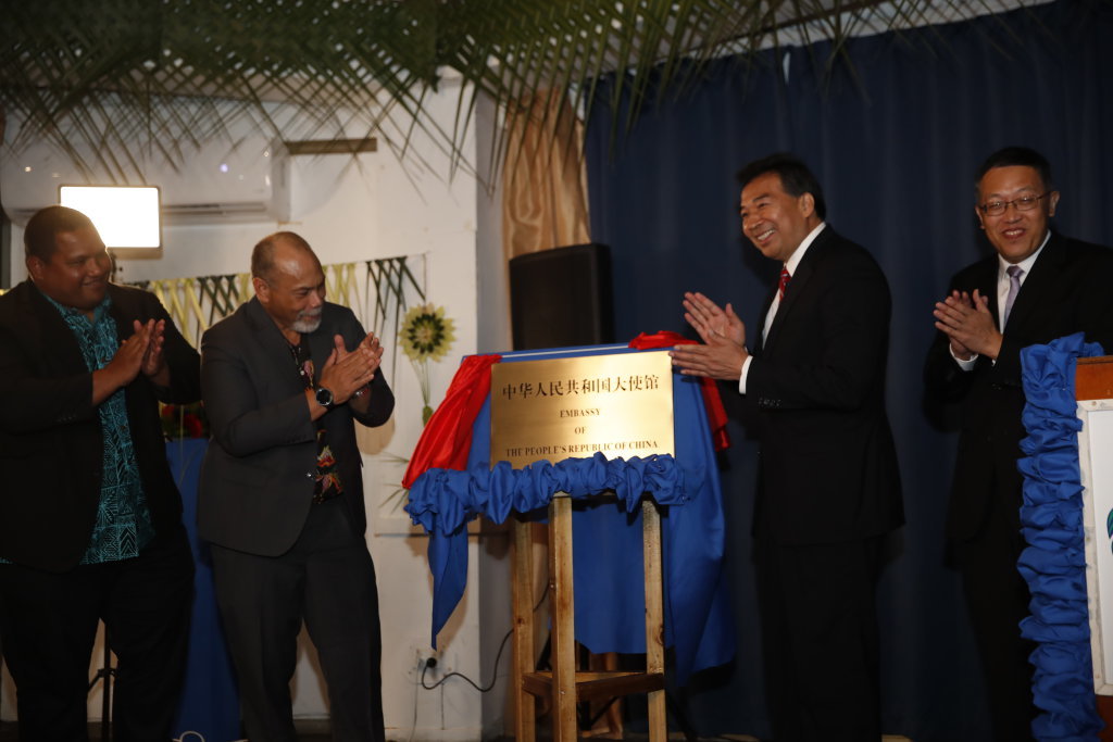 当地时间29日晚,中国驻瑙鲁使馆在瑙鲁岛东南部的一家酒店内举行复馆仪式。中国政府代表、国家国际发展合作署署长罗照辉和瑙鲁外长安格明共同为使馆揭牌。