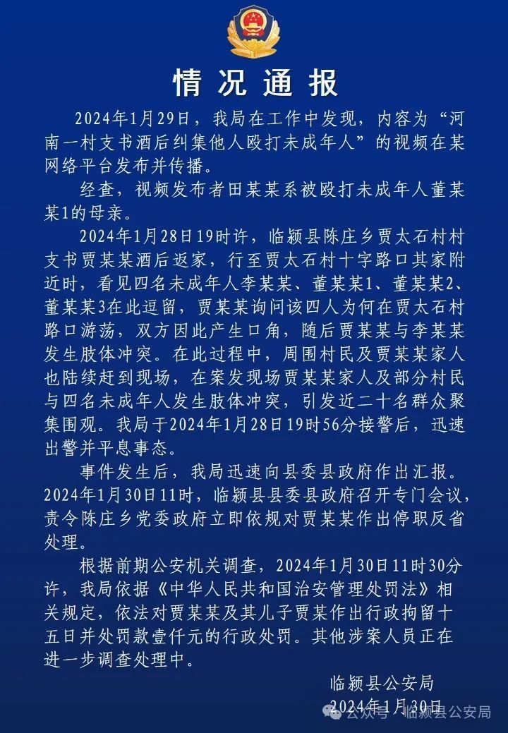 1月30日,河南临颍县公安局就网传“河南一村支书酒后纠集他人殴打未成年人”发布情况通报:1月30日11时,临颍县县委县政府召开专门会议,责令陈庄乡党委政府立即依规对贾某某作出停职反省处理。