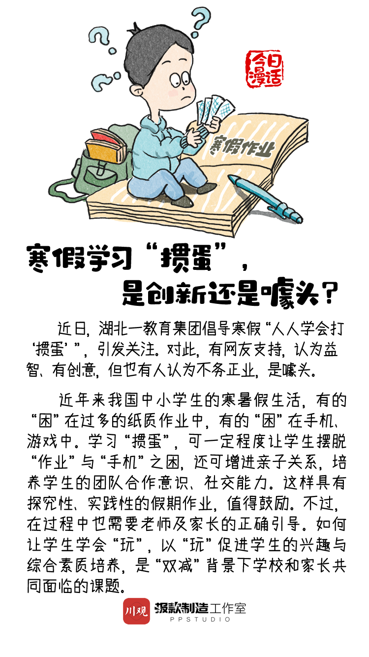 近日,湖北一教育集团倡导寒假“人人学会打‘掼蛋’”,引发关注。对此,有网友支持,认为益智、有创意,但也有人认为不务正业,是噱头。你怎么看?