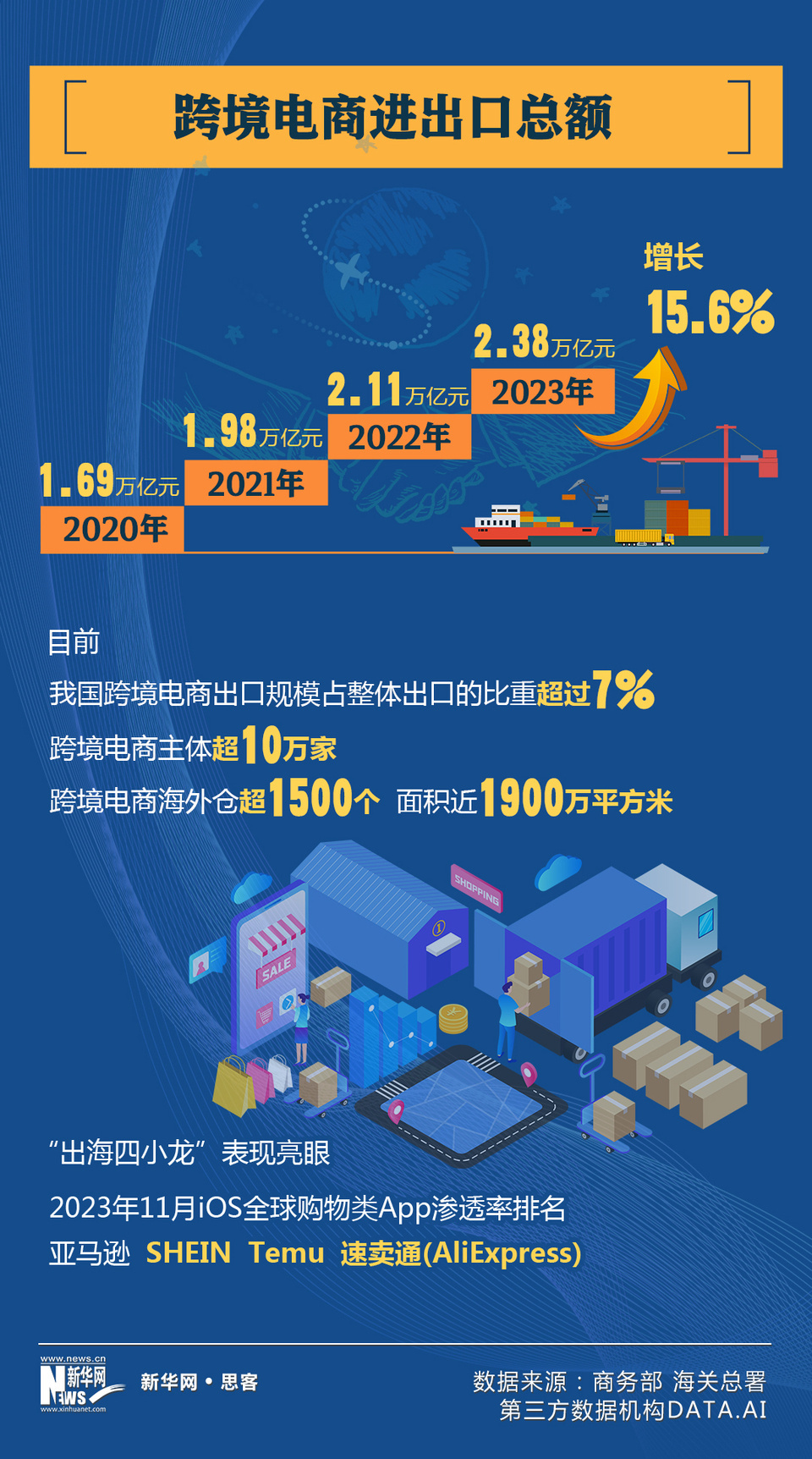 2023年以来,阿里、拼多多、京东、字节跳动等电商平台不断加码跨境电商业务。阿里上线外贸AI产品“生意助手”,Temu推出“全托管”模式,京东物流在国际供应链领域加速布局……2023年我国跨境电商进出口2.38万亿元,增长15.6%,参与跨境电商进口的消费者人数也逐年增加,2023年达到1.63亿。跨境电商商业模式迭代发展,让商家的出海链路得到简化,进一步降低了中小企业出海的门槛,让国外的消费者能“买全球、卖全球”,助力我国产品通达世界各地,成为外贸发展重要动能。