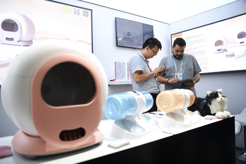 第134届广交会上,外国采购商在一家智能猫砂盆产品展台了解信息。新华社记者 邓华 摄