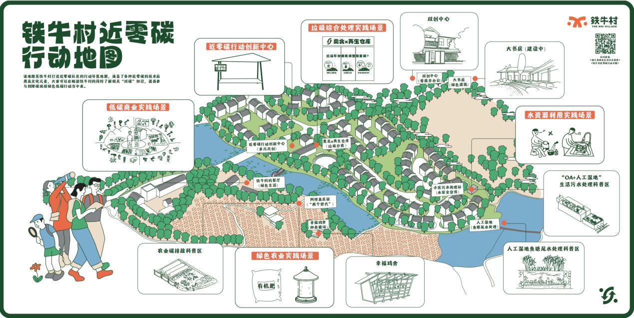 此外,重点营造铁牛乡村低碳实践场景,聚焦居民生产生活实际,围绕绿色农业、水资源利用、垃圾综合处理、低碳商业、行动创新中心等打造五大低碳实践场景,绘制近零碳行动地图,开发近零碳研学产品,串连“两个替代”生态柑橘种植示范园、种养循环“幸福鸡舍”、装配式建筑、奥北&再生仓库、“OA+人工湿地”污水处理站、生态湿地;打造“透水混泥土+绿道+智慧路灯+生态停车场”低碳出行系统;铁牛妈妈的餐厅通过碳惠天府低碳消费(餐饮)场景认证,协同3家商户加入“碳惠天府”普惠商业联盟,开展垃圾分类培训、生态种植培训等绿色低碳宣传活动6场,形成了本地居民、商户和游客参与铁牛村低碳社区建设互联互动的良好氛围。