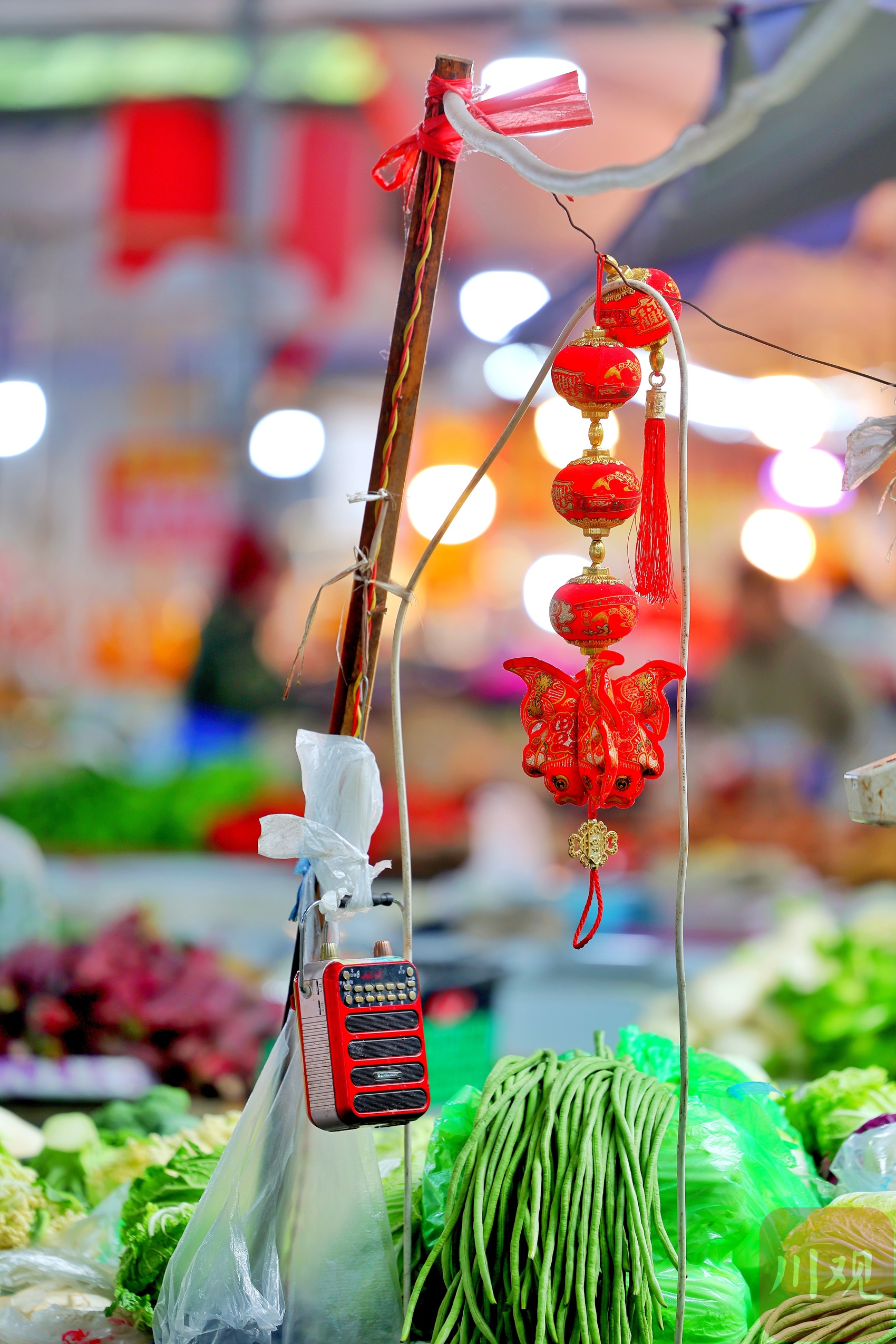 1月30日,成都市张家巷农贸市场内,菜摊前挂起了一串喜庆的红灯笼。