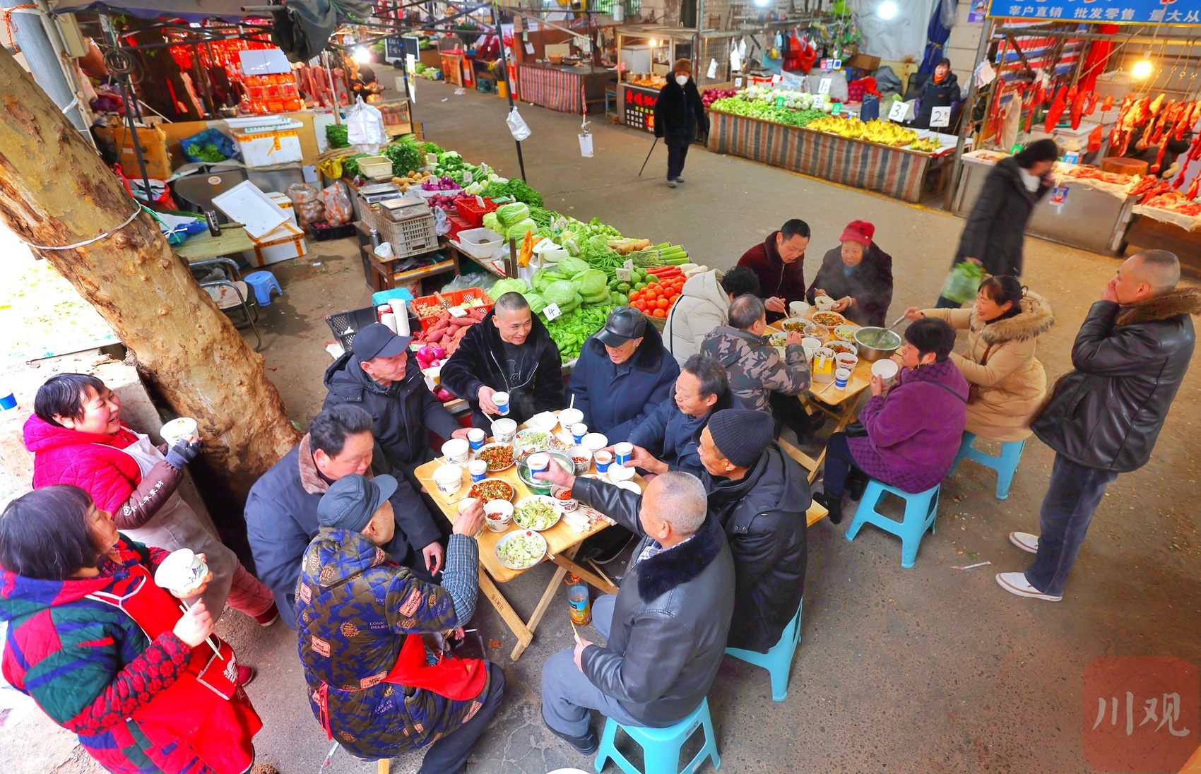 1月30日,成都市平福路农贸市场内几家摊主吃起了团圆饭。