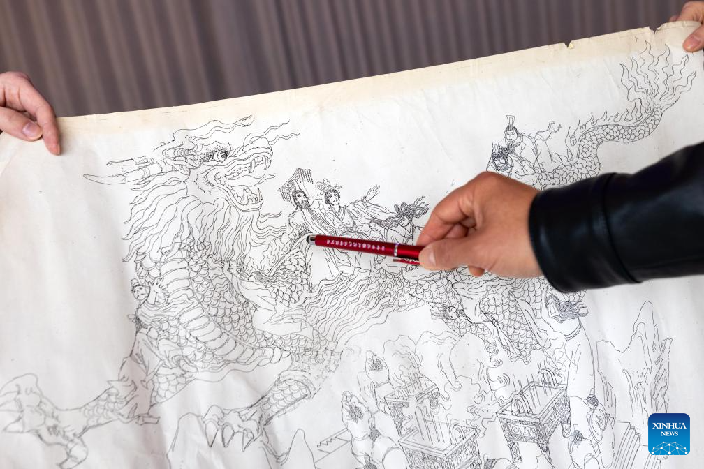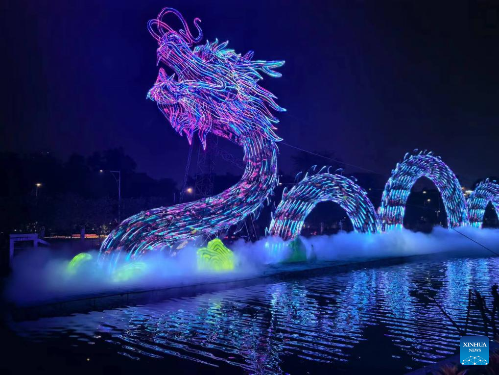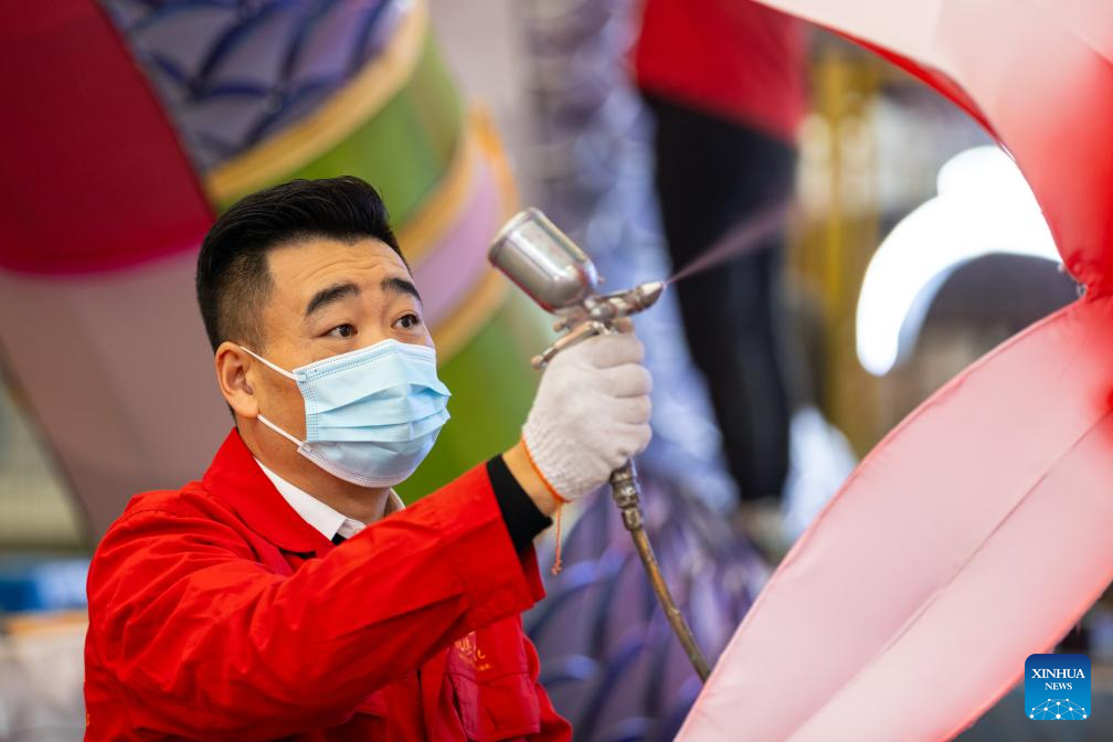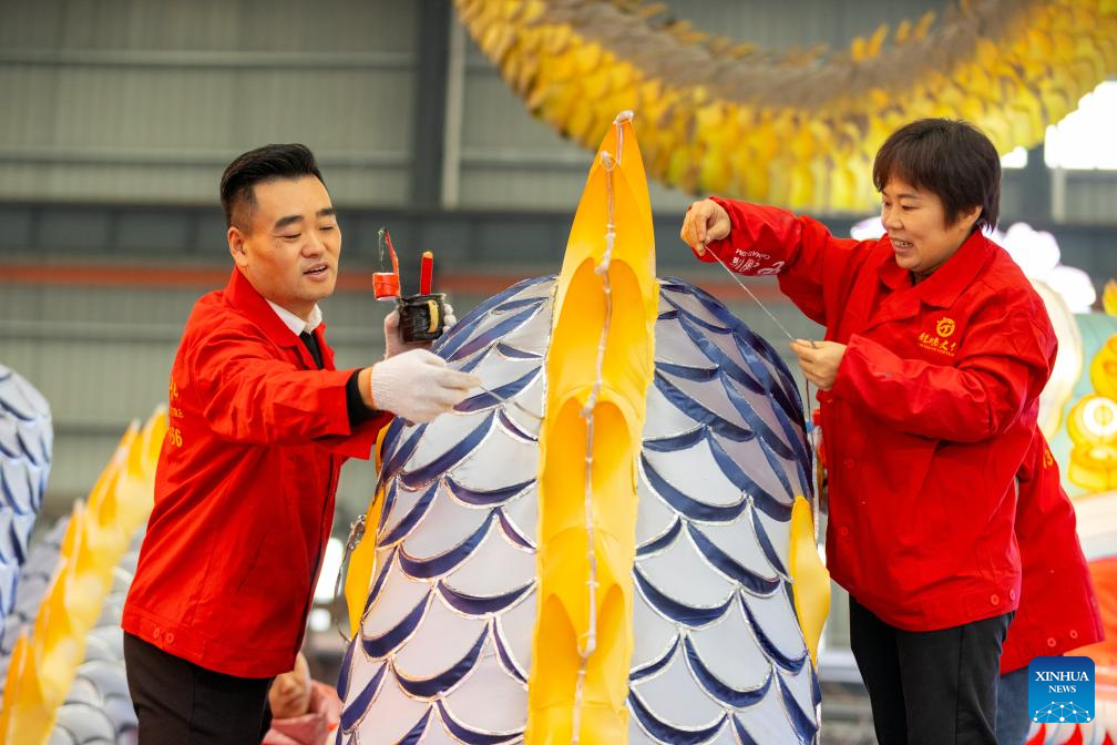 This photo taken on Jan. 29, 2024 shows a dragon-shaped lantern made by Deng Peilin's team for the upcoming Spring Festival in Guangzhou, south China's Guangdong Province.(Xinhua)