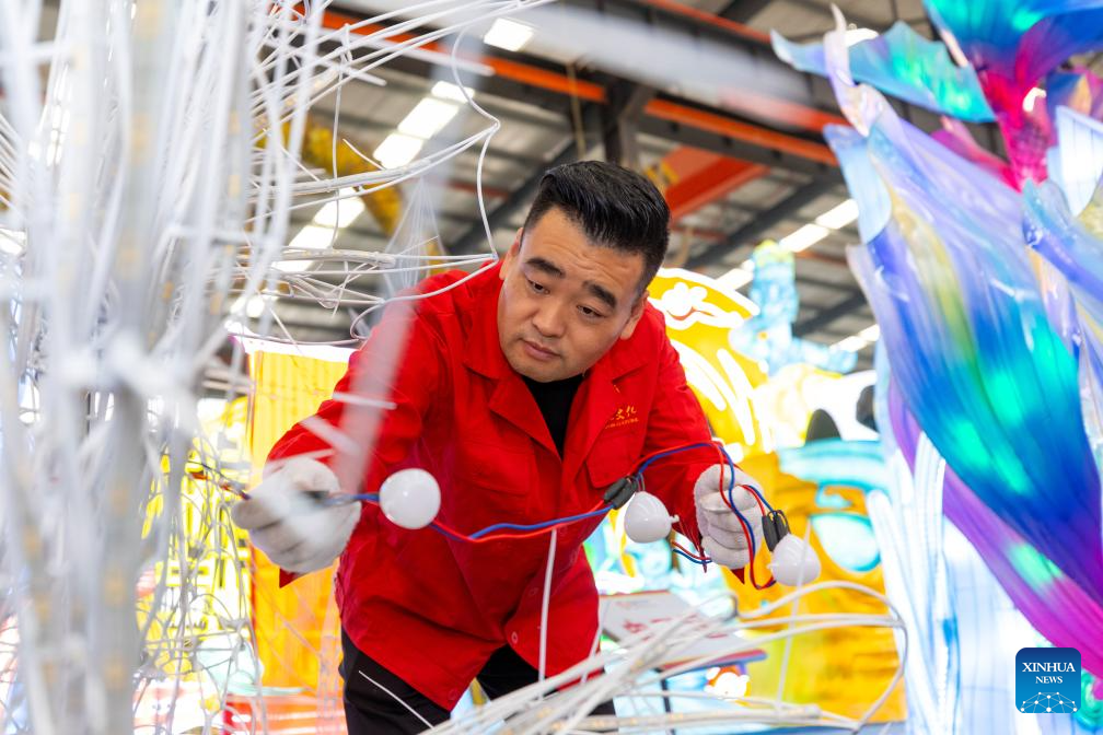 Deng Peilin installs components into lanterns in Zigong City, southwest China's Sichuan Province, Jan. 19, 2024. (Xinhua/Shen Bohan)