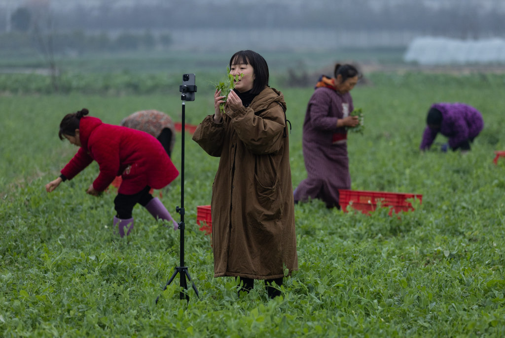 2月1日,在广汉市金轮镇樊池村,当地网络主播钟敏在豌豆尖地里直播带货。