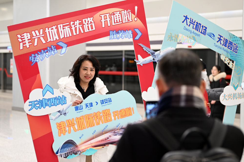 2023年12月18日,旅客在大兴机场站拍照留念。当日,津兴城际铁路正式开通运营。新华社记者 李然 摄