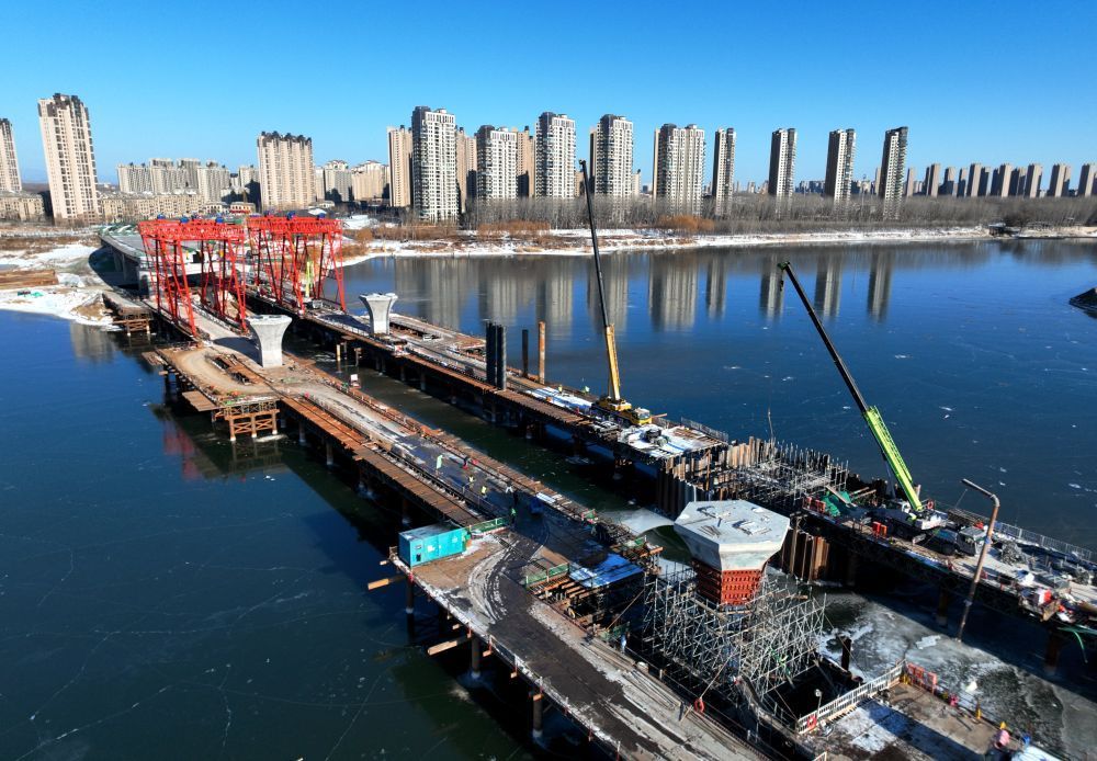 这是厂通路(河北省大厂回族自治县至北京市通州区)潮白河大桥施工现场(2023年12月21日摄,无人机照片)。新华社记者 王晓 摄