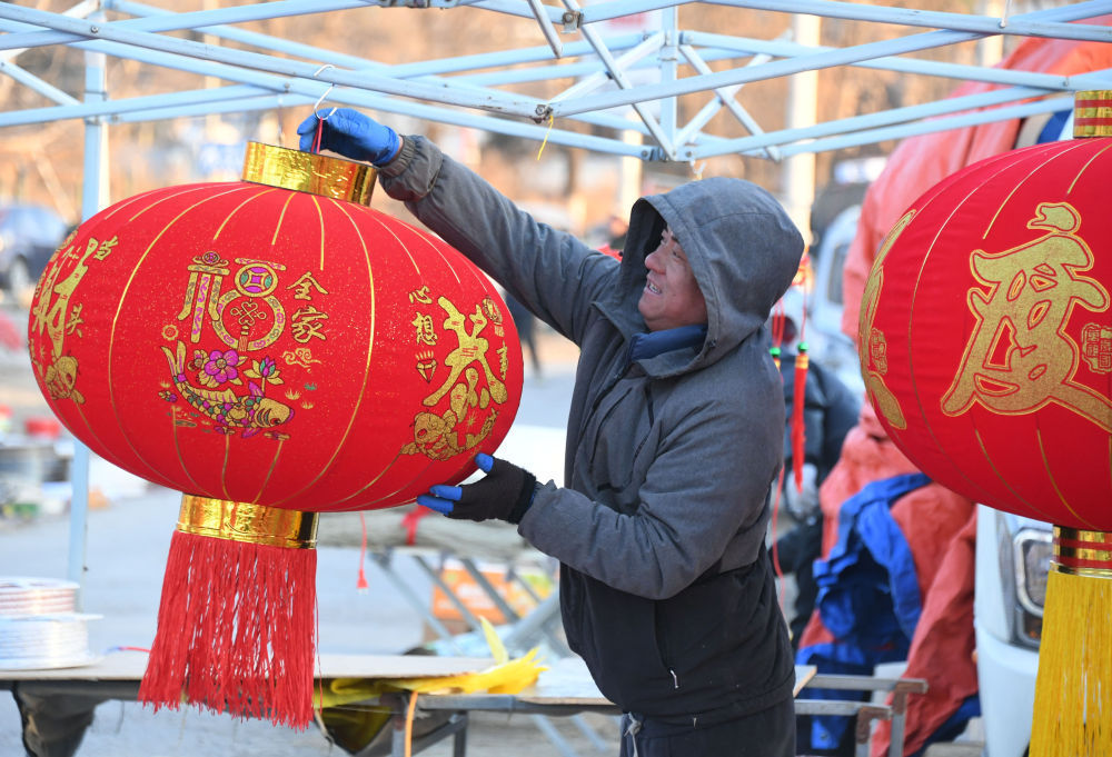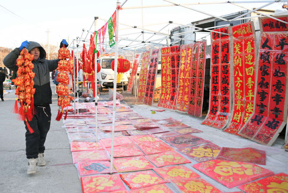2024年1月27日,在北京市平谷区金海湖镇靠山集大集,商户在布置摊位。新华社记者 任超 摄