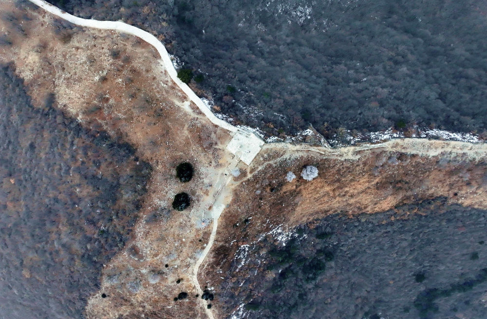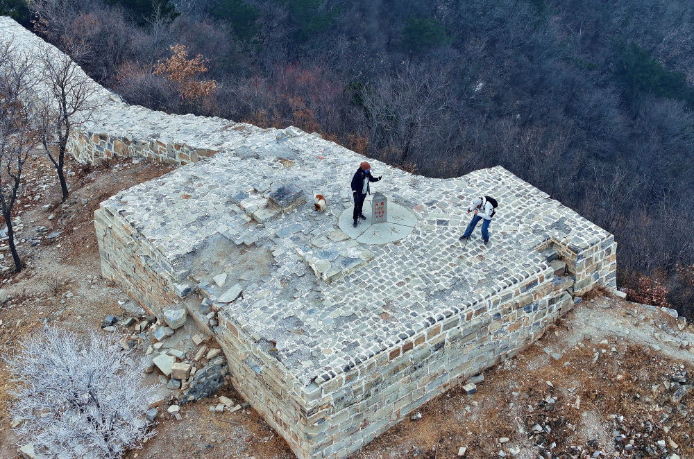 这是位于北京平谷、天津蓟州、河北承德交界处的三界碑,以长城和山脊为界划分出北京、天津和河北三地(2024年1月30日摄,无人机照片)。新华社记者 赵子硕 摄