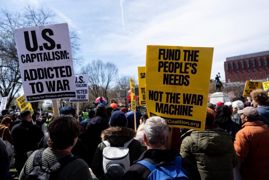 2023年3月18日,在美国首都华盛顿,反战人士在白宫前参加集会。当日,数百名反战人士在美国首都华盛顿市白宫北侧拉斐特广场举行集会,敦促美国政府反思伊拉克战争,呼吁美国关停“战争机器”。新华社记者刘杰摄