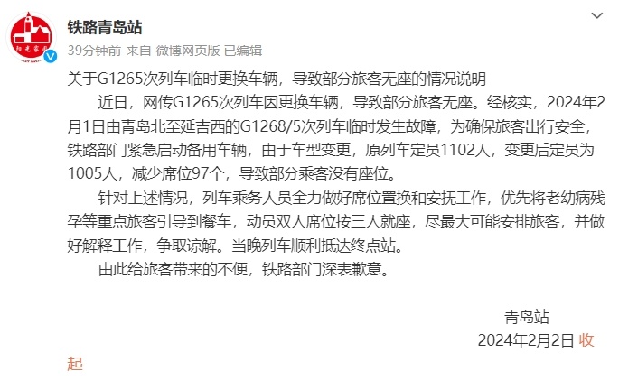 据@铁路青岛站微博消息,近日,网传G1265次列车因更换车辆,导致部分旅客无座。经核实,2024年2月1日由青岛北至延吉西的G1268/5次列车临时发生故障,为确保旅客出行安全,铁路部门紧急启动备用车辆,由于车型变更,原列车定员1102人,变更后定员为1005人,减少席位97个,导致部分乘客没有座位。