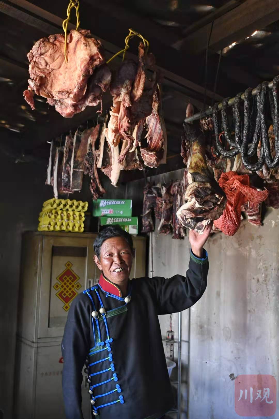 彝历新年刚刚过去几天,大凉山彝区处处洋溢着节日的浓厚氛围,家家户户的厨房里,悬挂着腊肉、香肠。走进吉地尔子家厨房,挂着满满的腊肉香肠。