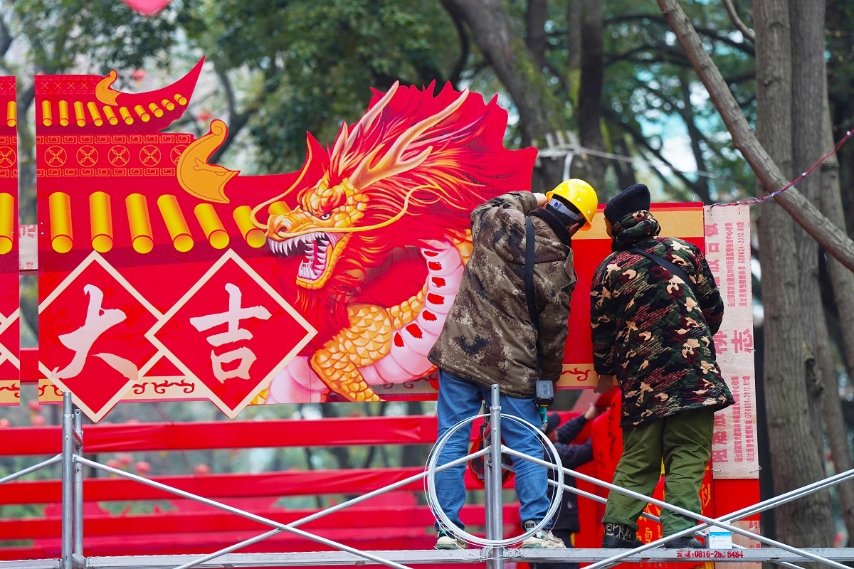 人民公园内工人们正在进行春节的氛围营造(付乔崧摄)
