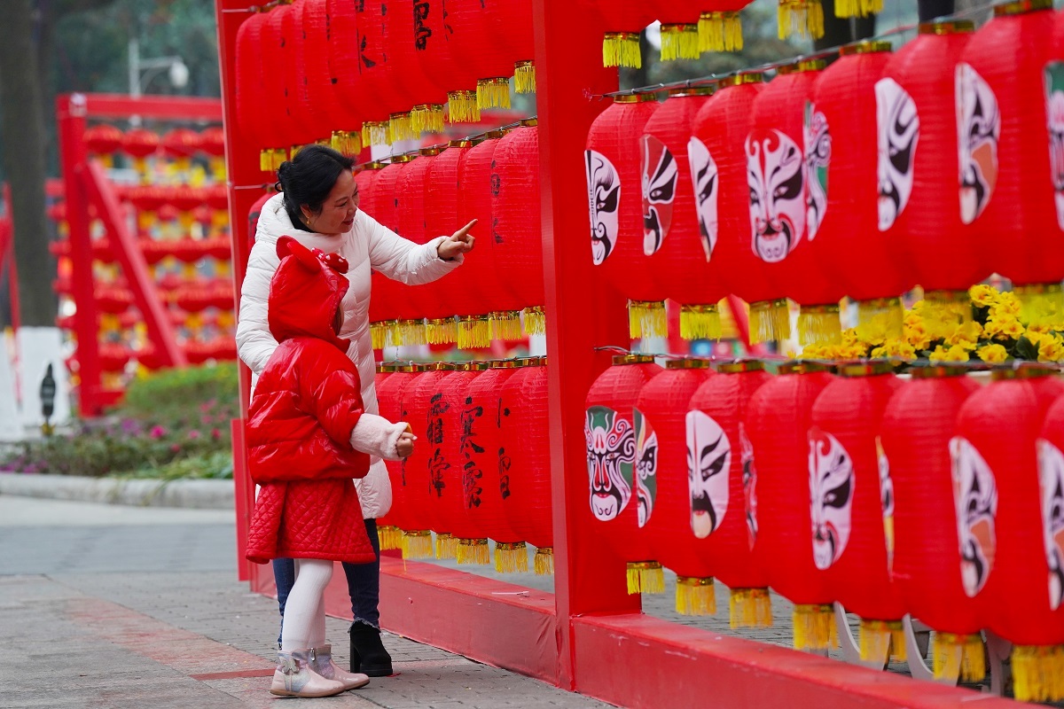 人民公园内大人教小孩识灯笼上的汉字(付乔崧摄)