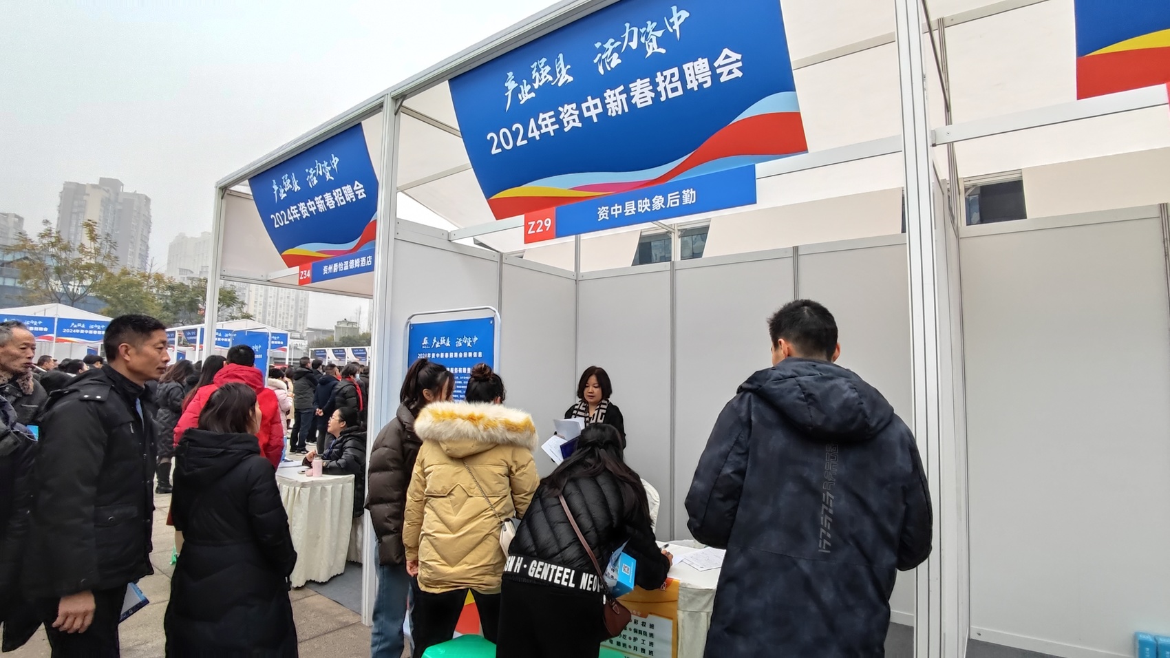 2月2日,资中县新春送岗招聘会在苌弘大剧院外的广场举行,涉及农业、物流、教育、餐饮等多个行业的36家企业到场,共提供招聘岗位1162个,吸引不少市民前来求职。