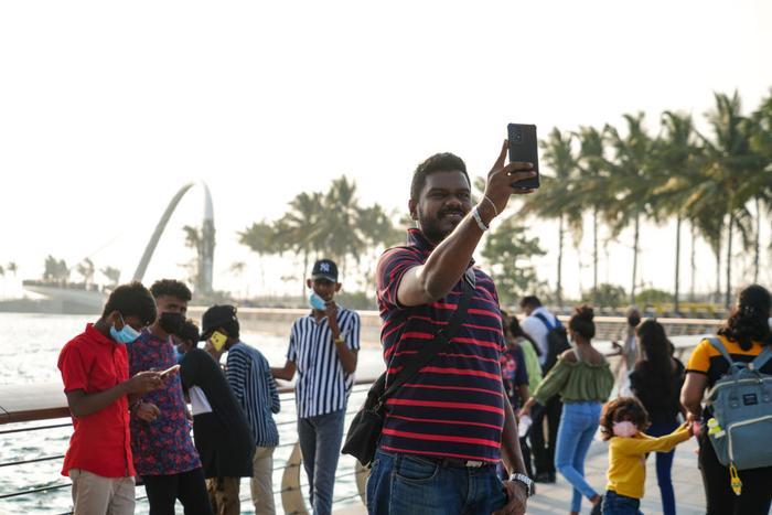 2022年1月22日,游客在斯里兰卡科伦坡港口城的海滨长廊自拍。图据新华社