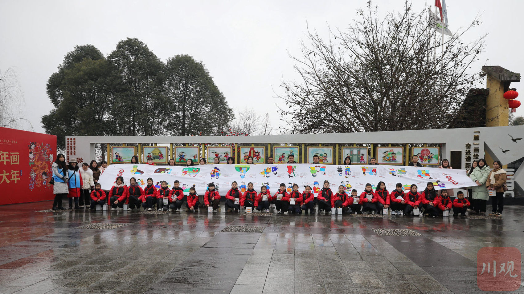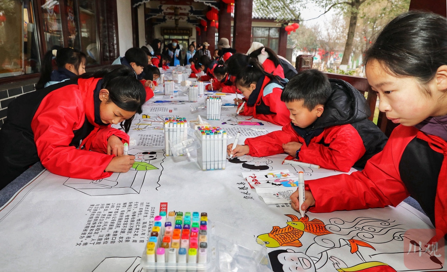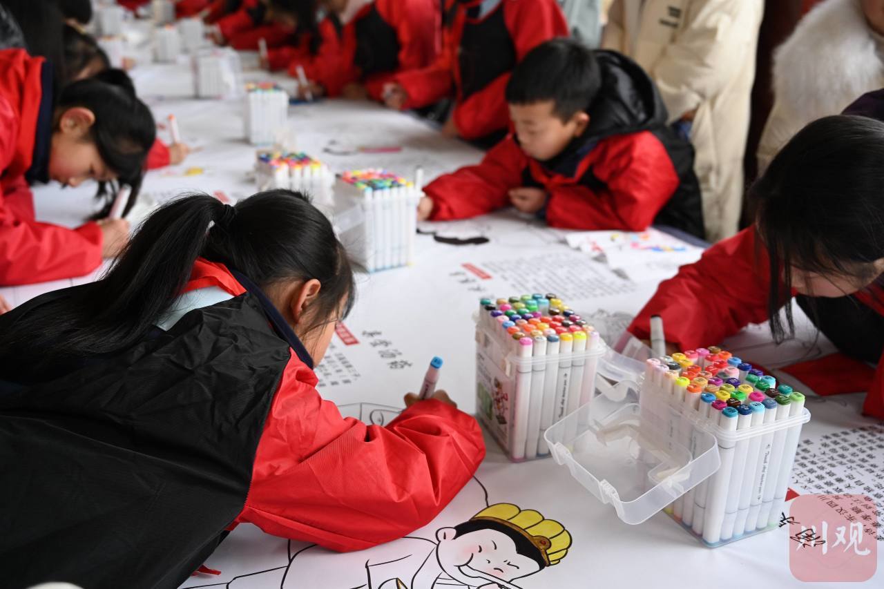 与此同时,孝德镇年画村分会场上,民俗文化系列活动也在如火如荼地开展。在绵竹年画展示馆广场上,清道学校的孩子们用年画方式长卷绘孝心,在绘有二十四孝图案的画卷上用心地创作着。一抹抹充满生机的色彩出现在画中,一颗颗代表中华民族传统美德的种子便深植在了孩子的心间。