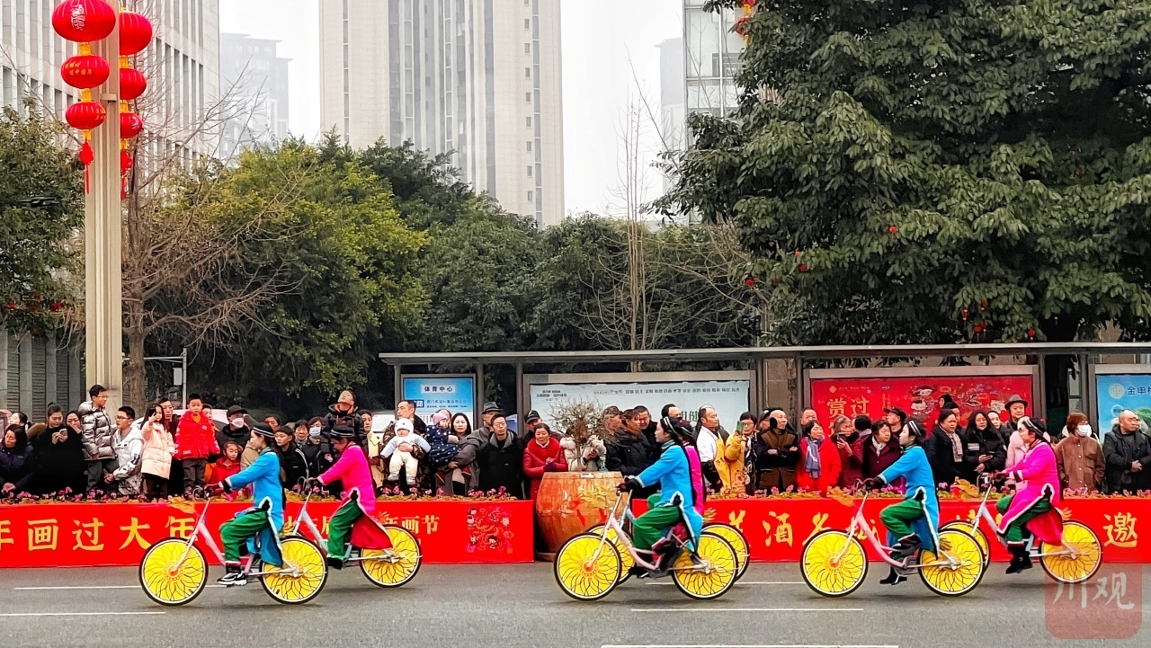 主会场上,绵竹年画节巡游表演的队伍犹如一条长龙。绵竹市的市民自发参与表演,化身年画里的角色,把年画里的精彩故事搬到现实中的大舞台上,将年画里蕴含的吉祥寓意传递给无数观众,赢得中外观众的阵阵欢呼和掌声。