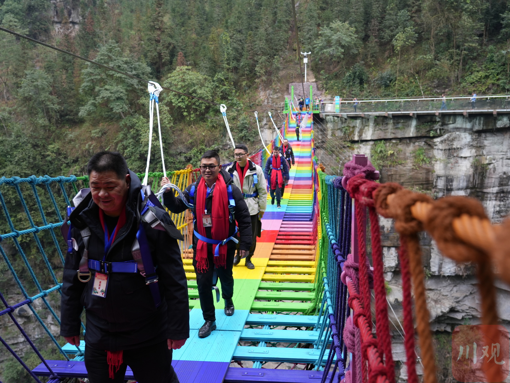 开园仪式结束后,龙神沟徒步活动随后启动。沿着蜿蜒的山路一路前行,群山叠翠、流泉飞瀑……丰富的负氧离子令人神清气爽,堪称天热氧吧。前行途中,彩虹桥、玻璃栈道、亲水步道、露营基地等项目陆续映入眼帘,项目新颖,业态丰富。站在玻璃栈道上,可以远眺周围自然景色与乡村风光,带给游客不一样的视觉体验。