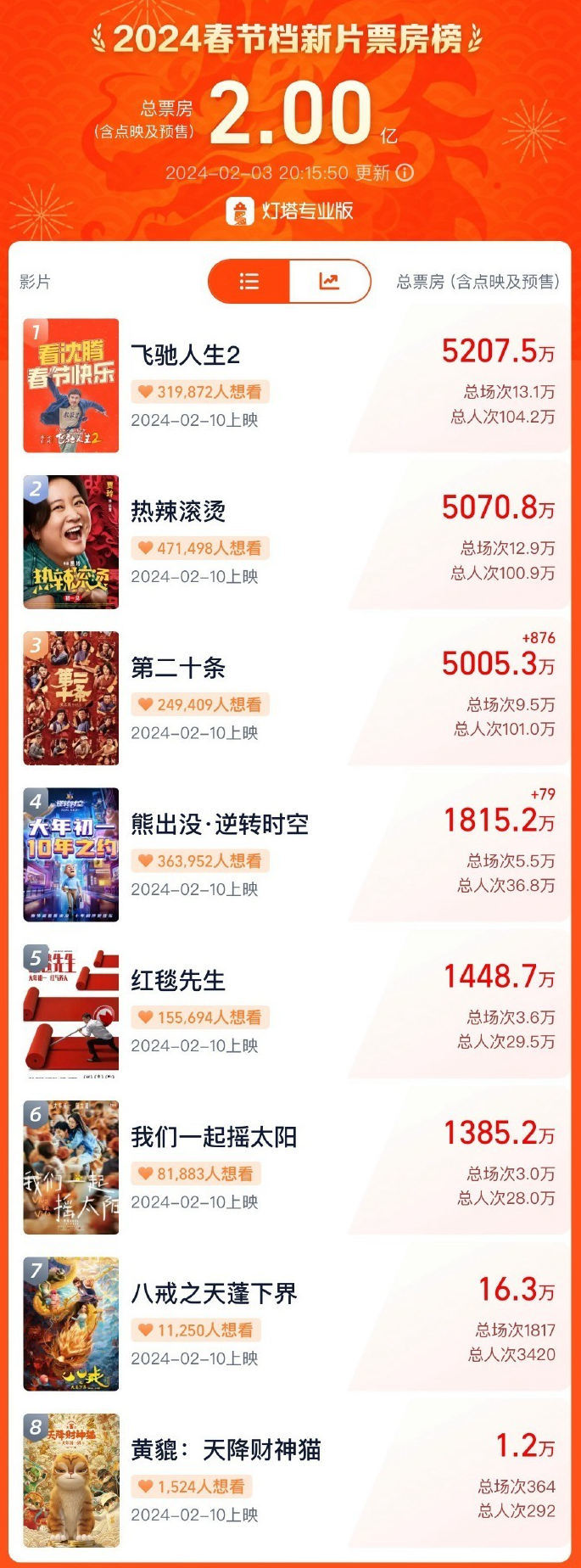 据灯塔专业版,截至2月3日20时15分,2024春节档新片预售总票房突破2亿元!《飞驰人生2》《热辣滚烫》《第二十条》暂列春节档新片预售票房前三位,且预售票房均突破5000万。