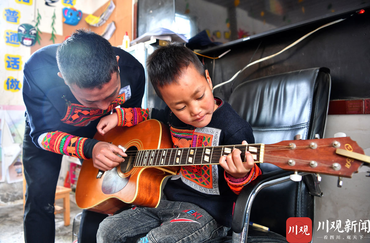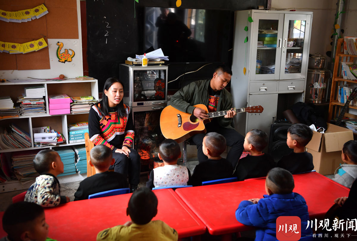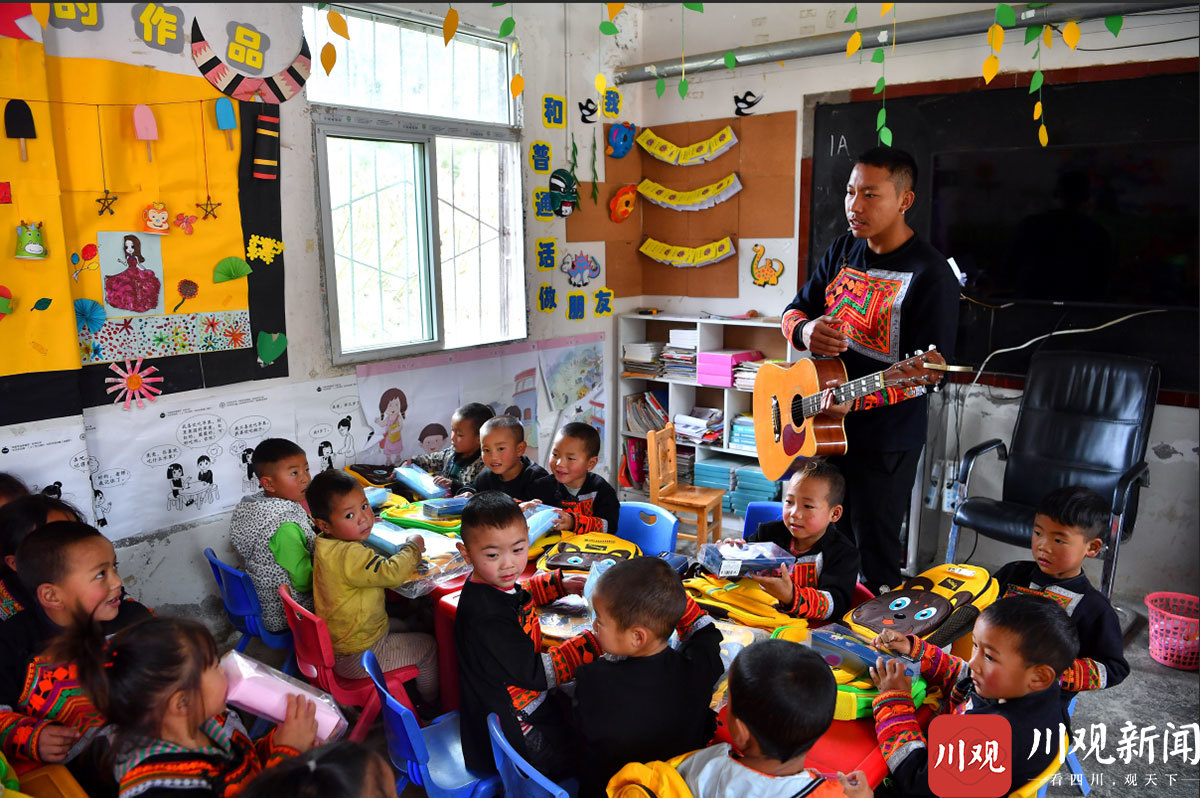 11月30日,惹几曲且拿出吉他,手指在琴弦上拨弄几下,发出了一串美妙的音乐,教室里的孩子们一下就安静下来,他们知道马上就要唱歌。在吉他声的伴奏下,“黑黑的天空低垂 亮亮的繁星相随 虫儿飞 虫儿飞 你在思念谁 ……”,孩子们一起合唱起来,好听的歌声从大山上幼教点里传出。