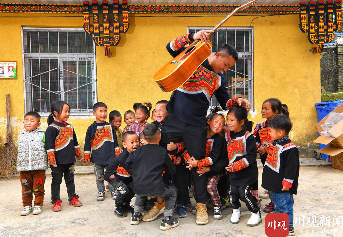 惹几曲且是凉山州美姑县洛俄依甘乡阿居曲村幼教点的辅导员,他已经在幼教点工作了两年。为了村里的100多个学前儿童,他每天都给孩子们教普通话和唱儿歌。因为以前学习过吉他弹奏,为了孩子对音乐更感兴趣,惹几曲且自己学习儿歌的乐谱,每次孩子们学儿歌时他就伴奏,让孩子们切实的接触到音乐。“现在我们班上的孩子已经有人开始想学习吉他弹奏,”惹几曲且介绍说,“这就是手中这把吉他带给孩子们的改变。”