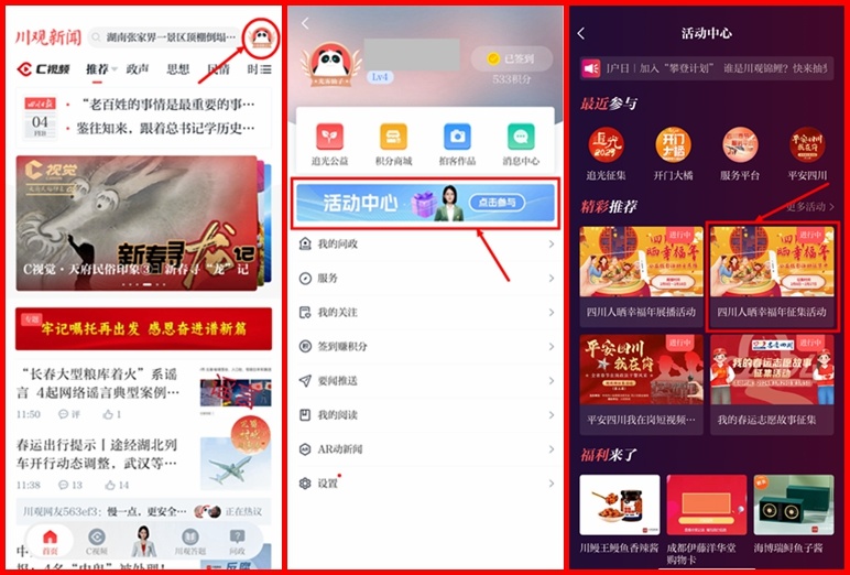 2、川观新闻客户端进入“活动中心”,点击“四川人晒幸福年 征集”活动页面参与投稿。