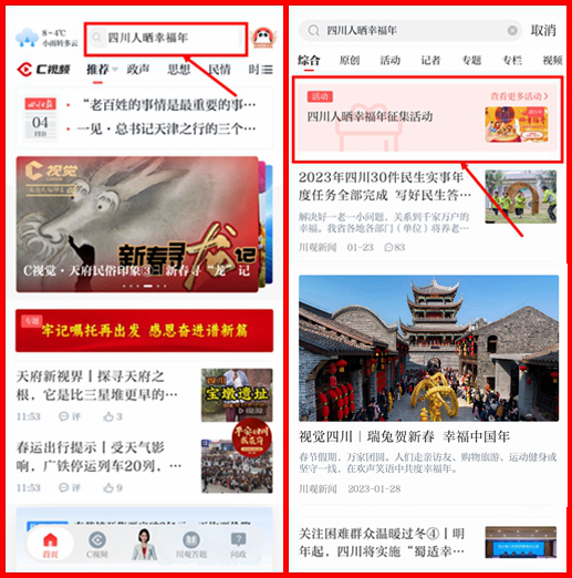 3、在川观新闻首页顶部搜索框输入“四川人晒幸福年”,点击活动链接即可参与。