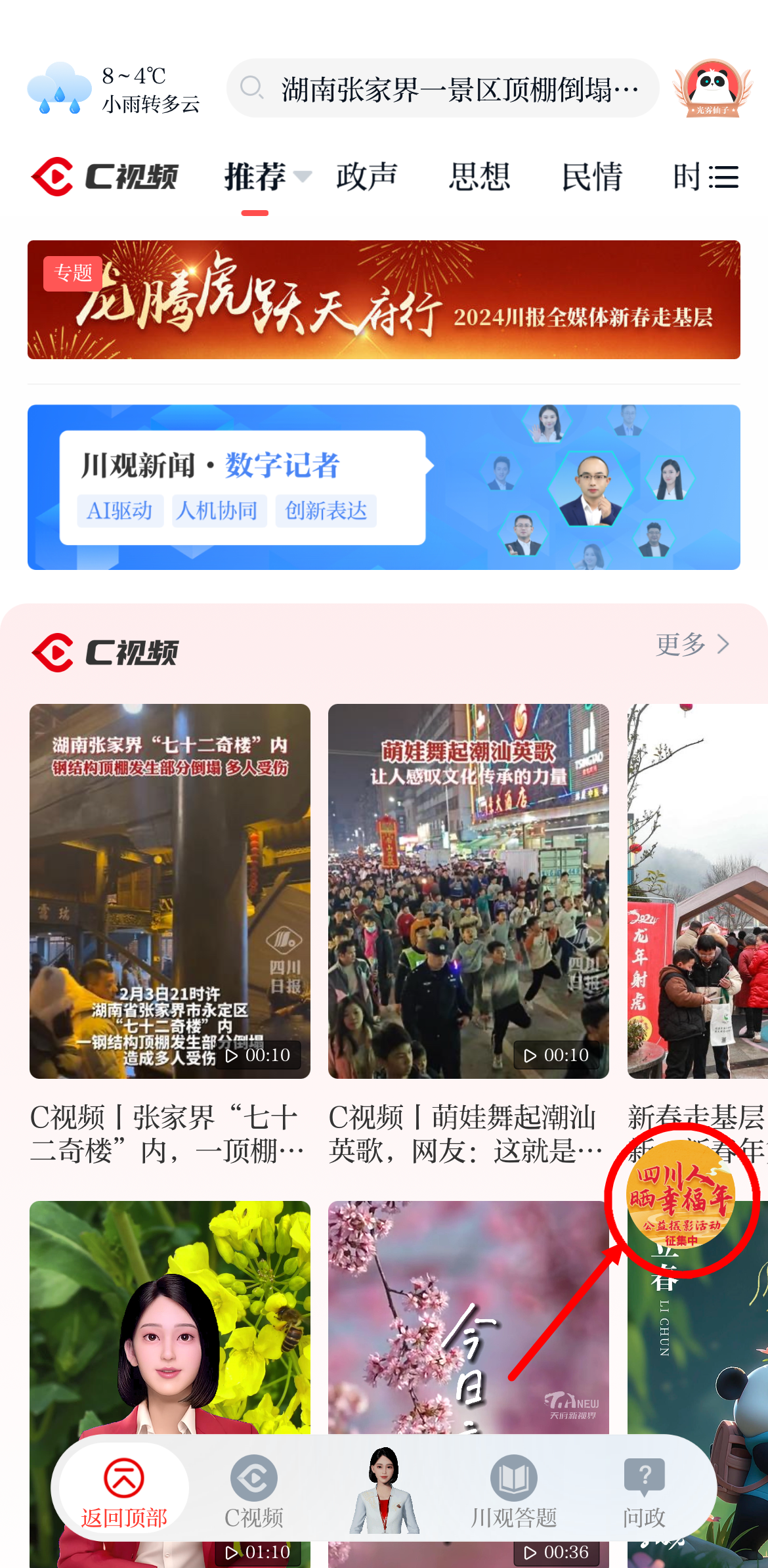 1、在川观新闻首页,点击悬浮球,找到“四川人晒幸福年”图标,点击即可参与投稿。