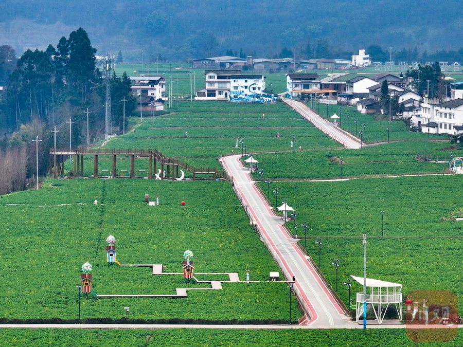 走出基地大门,呈现在采访小分队眼前的是一大片绿油油的油菜,叶子上还挂着晶莹的雨露,田间小路上画着与镇名谐音的五彩“五线谱”。在田间设置的一座观光桥,已是一处网红打卡点。