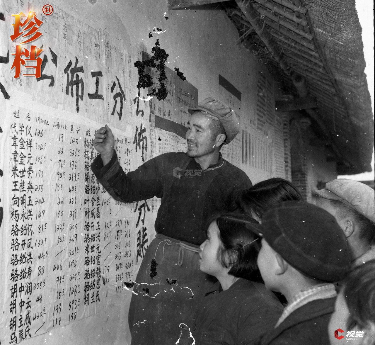 1964年底,郫县德源公社四大队三生产队记分员洛绍品向社员公布工分。 马继文 摄