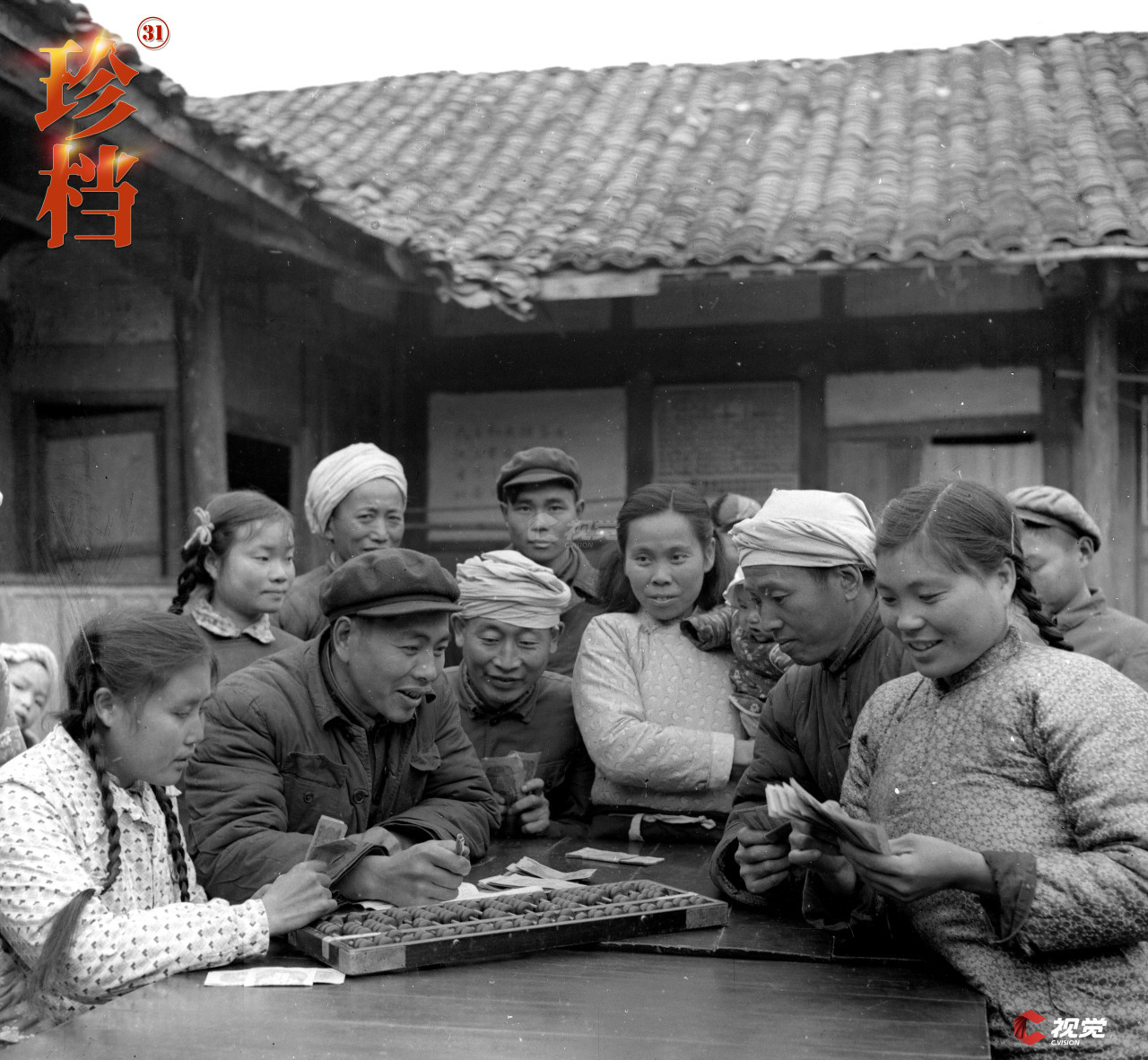 1960年底,郫县崇兴公社金桥管区工作人员给社员们结算收入。