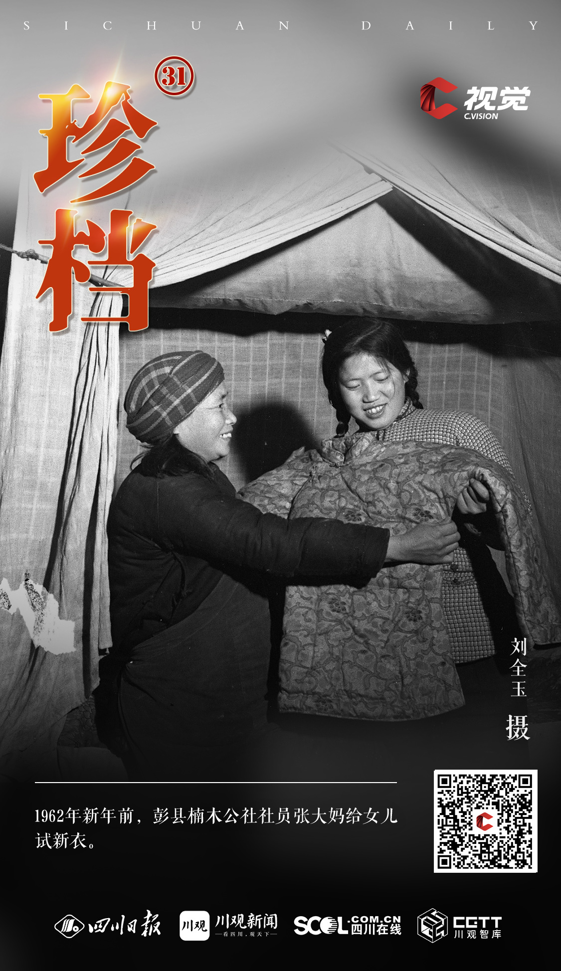 1962年新年前,彭县楠木公社社员张大妈给女儿试新衣。 刘全玉 摄