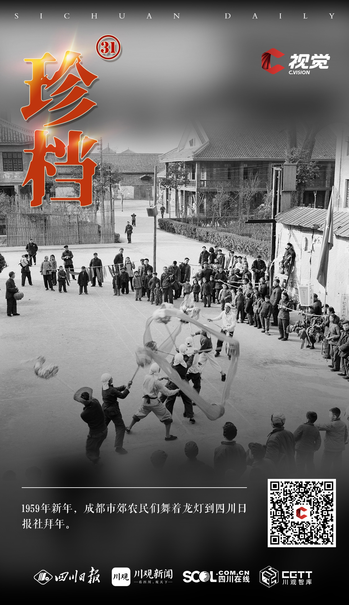 1959年新年,成都市郊农民们舞着龙灯到四川日报社拜年。